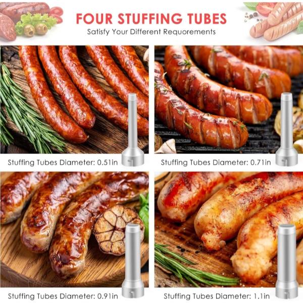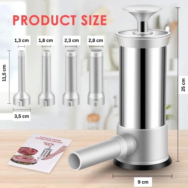 Този уред за пълнене на колбаси включва четири накрайника от полипропилен с различен диаметър: 1,3 см. 1,8 cm, 2,3 cm и 2,8 cm.