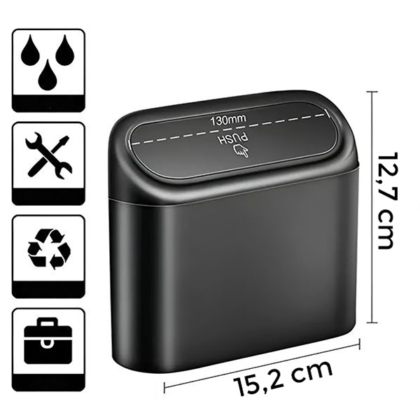 Този компактен кош за боклук поддържа автомобила Ви чист и организиран, без да заема твърде много място. Дизайнът му предлага достатъчен капацитет за ежедневните отпадъци, което го прави практичен и ненатрапчив.