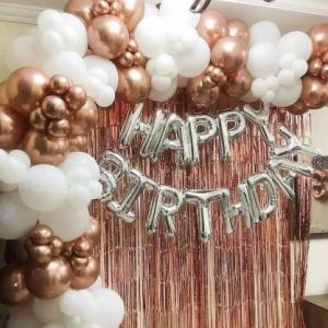 60 балона в различни цветове; 1x балон с форма на корона; 2x балона с форма на петолъчна звезда; 2x балона с форма на четирилъчна звезда; 1x завеса от блестящи панделки; 1x банер „Честит рожден ден“; 5x комплект цветни декоративни пискюли; 1x декорация за торта „Честит рожден ден“; декоративна панделка, аксесоари за връзване на балони, лепило и лента за закрепване на балони.