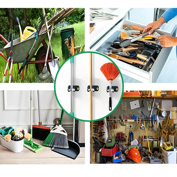 Тези държачи са идеални не само за метли и мопове, но и за градински инструменти, чадъри или дори в гаража, за да поддържате оборудването си в ред. Независимо дали са в близост до входната врата, в банята, кухнята или навън в градината, тези държачи ще намерят своето място във всяка част на дома Ви.